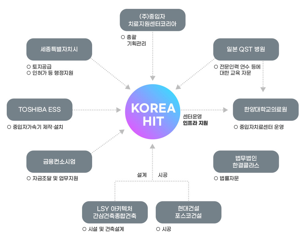 본 프로젝트는 세종특별자치시, 한양대학교 의료원, 그리고 (주)Korea HIT, (주)중입자치료지원센터코리아가 협력하여, 순수 민간자본으로 세종시 일대에 중입자치료센터와 부대시설을 건축·운영하고자 하는 프로젝트로서, 2031년 개원을 목표로 하고 있습니다.