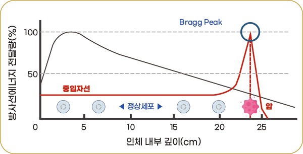 중입자치료가 기존 방사선 치료보다 더욱 효과적인 이유는 브래그 피크(Bragg Peak)라는 특징 때문입니다. 몸의 표면에서는 방사선량이 적지만, 몸 속 암 조직에 도달하면 방사선량이 최대가 되어 암 사멸효과가 큰 반면, 정상세포에 미치는 영향은 최소화함으로써 부작용을 억제할 수 있습니다.