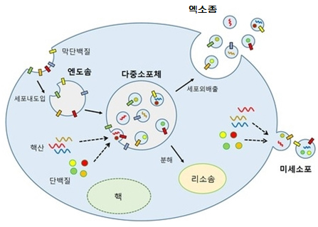 엑소좀은 이웃하거나 멀리 떨어진 세포/조직 간의 통신을 매개하는 전령(메신저) 역할을 합니다. 이들은 단백질, 유전 물질 및 지질을 전달할 수 있으며 표적 세포의 특성과 기능에 변화를 일으킵니다.