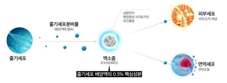 줄기세포 및 손상된 조직에서 방출된 엑소좀은 이웃 세포의 행동에 영향을 미치고 세포 성장을 촉진하여 조직 복구 및 재생에 기여합니다. 현재 대부분의 줄기세포 치료법이 중간엽세포를 이용하고 있으며, 중간엽줄기세포에서 분비되는 엑소좀을 회수하여 자가면역/만성염증/섬유화질환 등에 적용하고 있습니다.